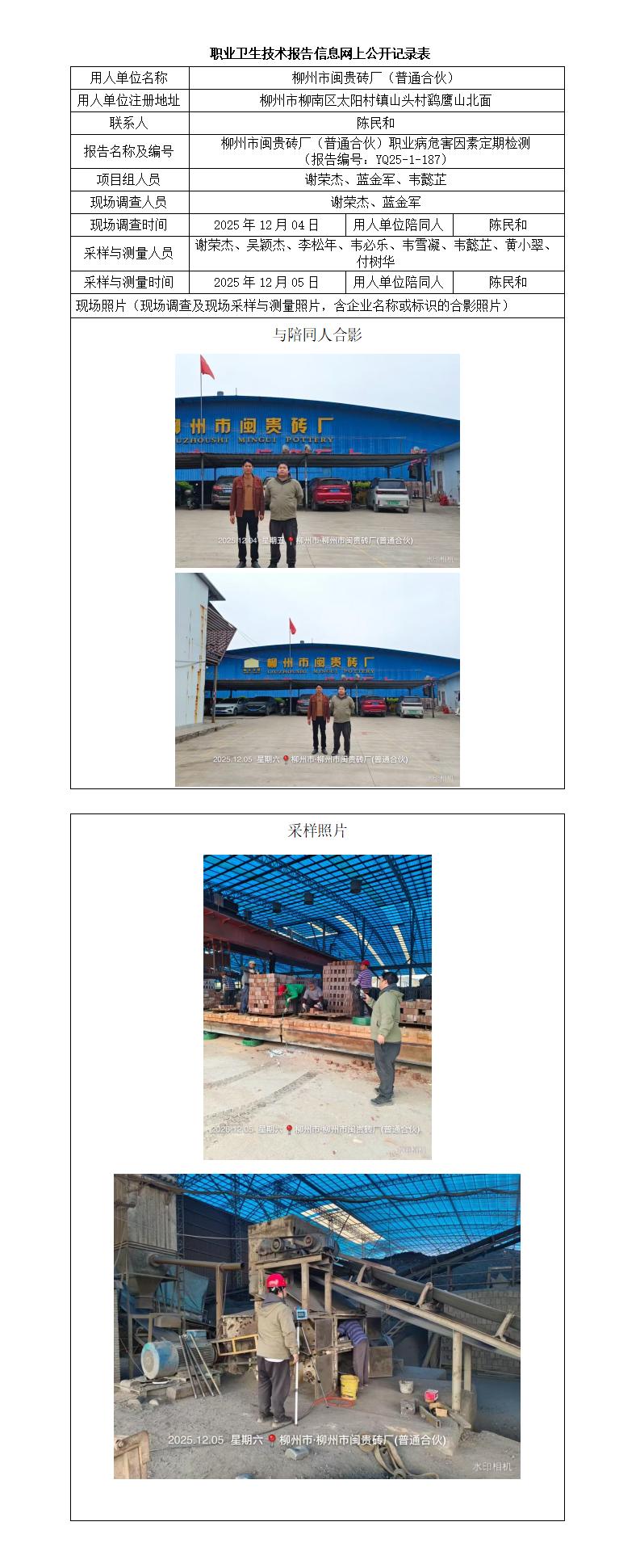 柳州市閩貴磚廠(普通合伙)職業(yè)病危害因素定期檢測 (報告編號:YQ25-1-187)