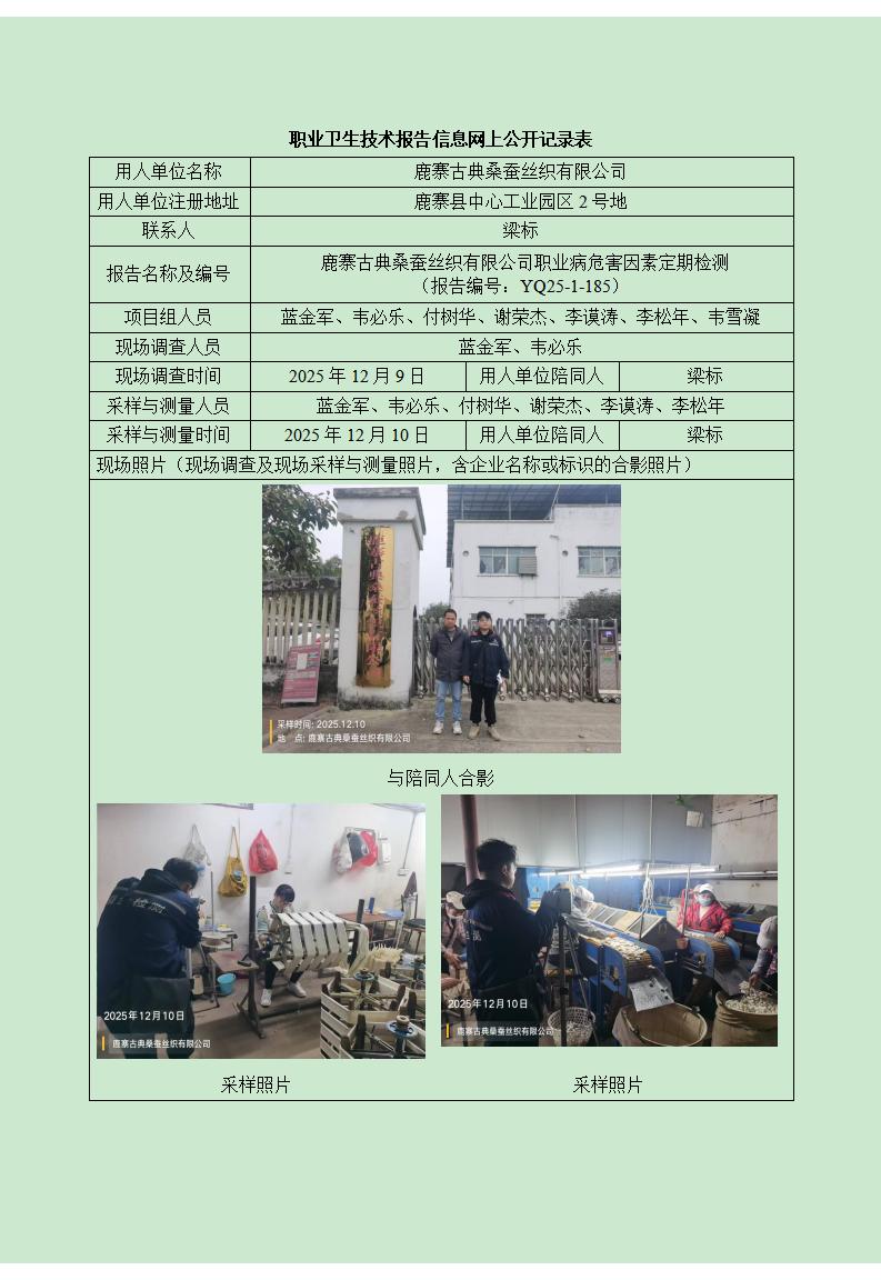 鹿寨古典桑蠶絲織有限公司職業(yè)病危害因素定期檢測信息公開